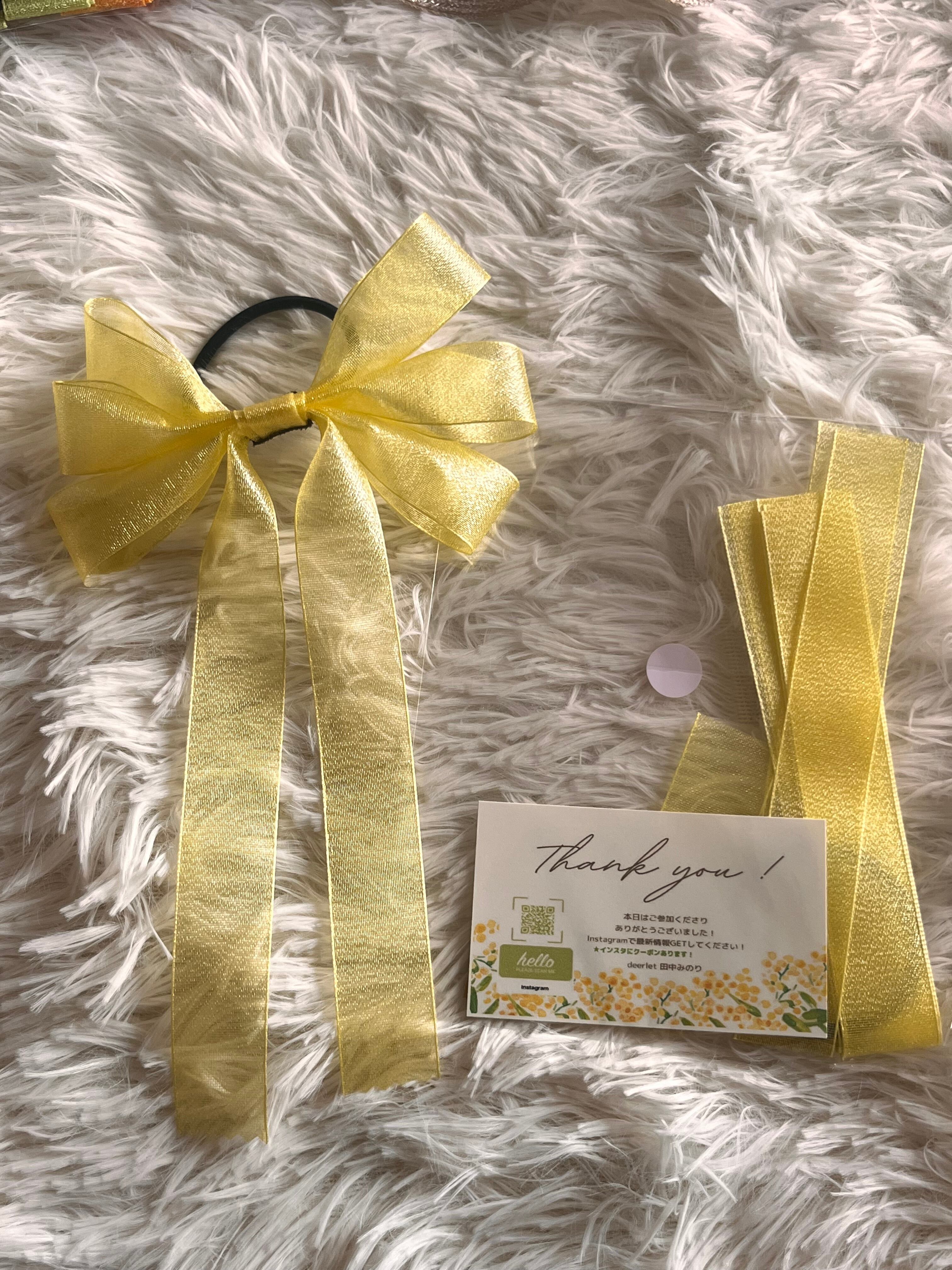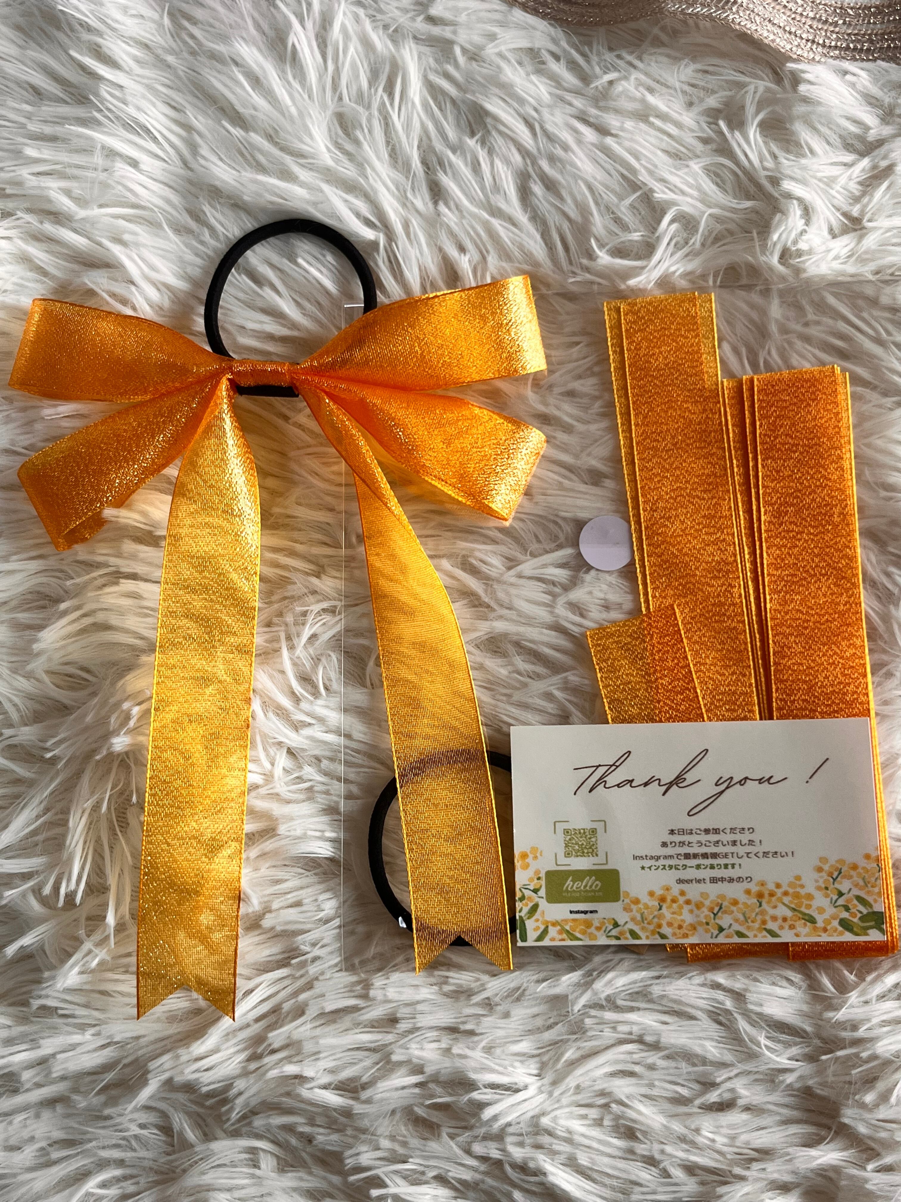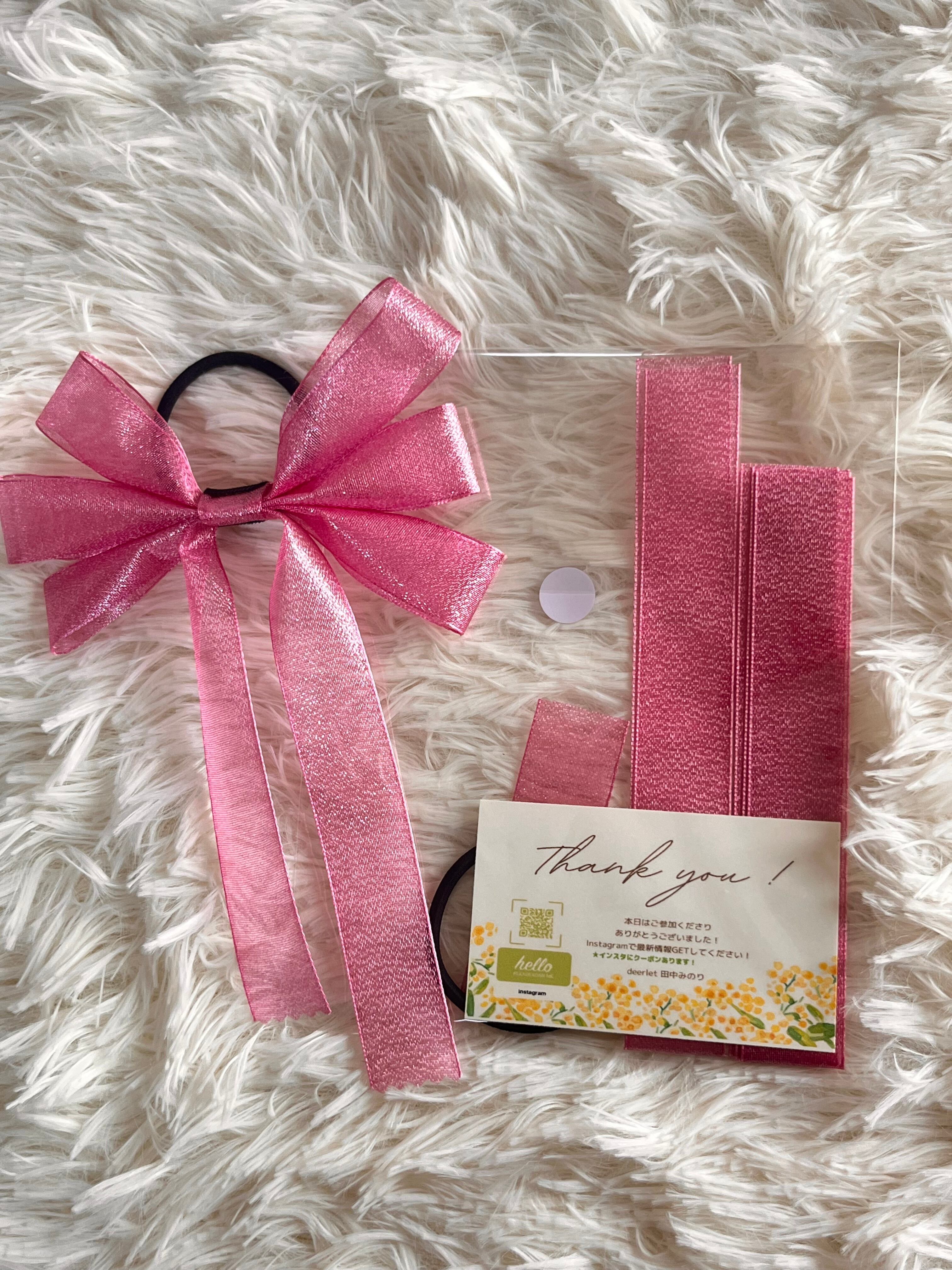 キットには、硬さがあり輝くクリスタルのような素材が含まれたリボンとヘアゴムなどが入っていてオリジナルのリボンを作ることができます。